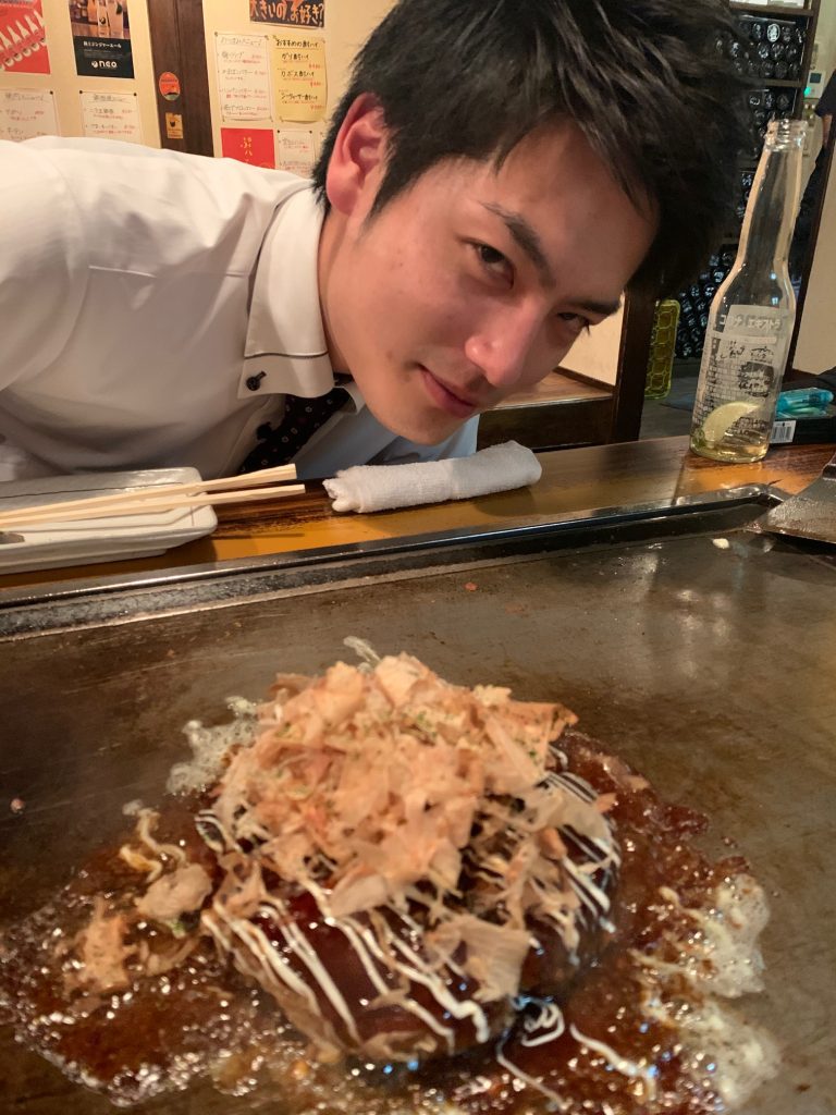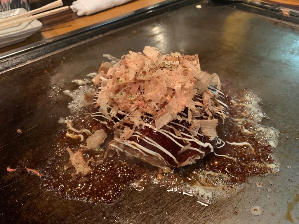 お好み焼きを注文したんだけどな?と思いながら待っていると、店員さんが手際良く、ソースにマヨネーズ、かつお節を乗せ、ついに完成しました!