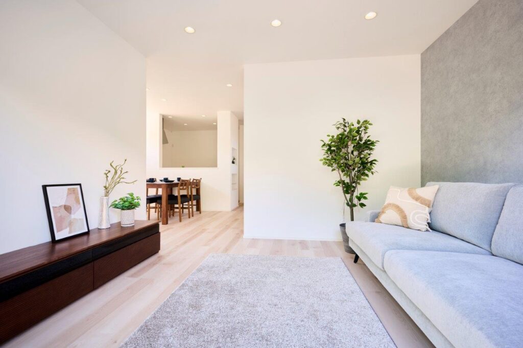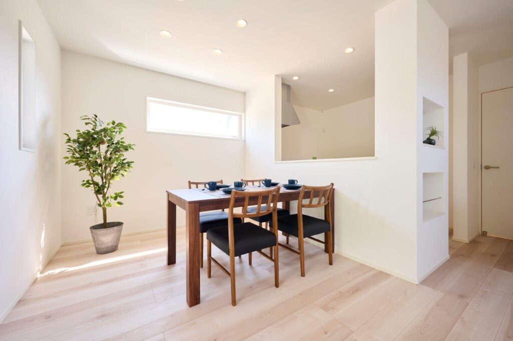 ダイニングテーブルは6人掛けでも設置できるように。また、リビングはL字型のような大きめのソファをゆったりと置けるように考えました(写真の家具は少しイメージと違います💦)