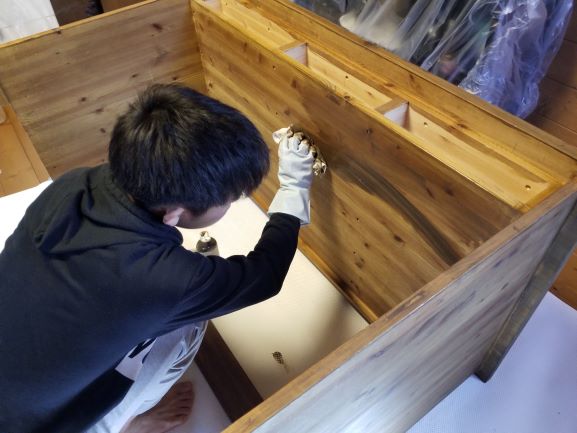 塗料を布に馴染ませて刷り込んでいく。