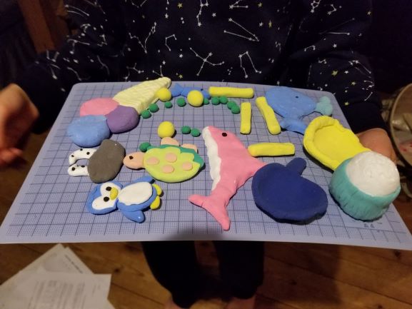 小学生の長女は、妻と紙粘土であそんでました。絵の具を使ってカラフルに仕上げました。