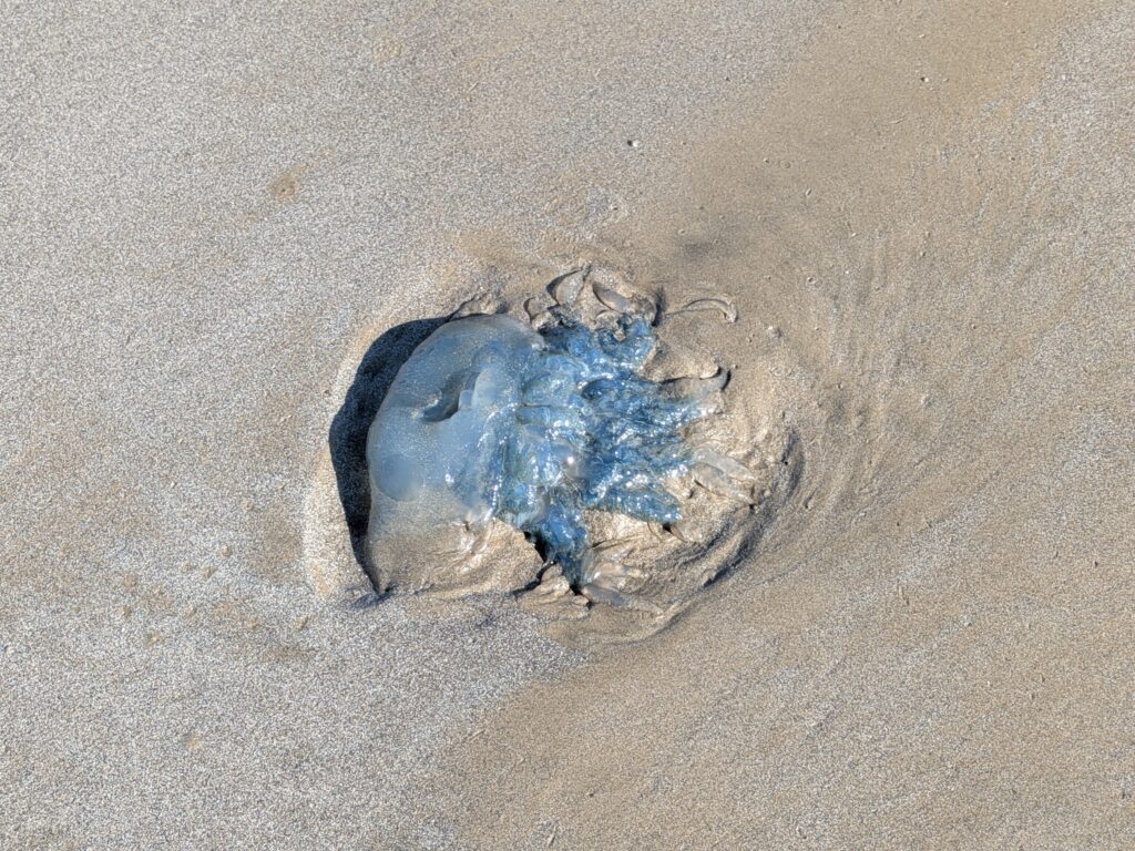 これは、ビゼンクラゲというらしい。直径20センチくらいあったので慌ててリードを引きました。