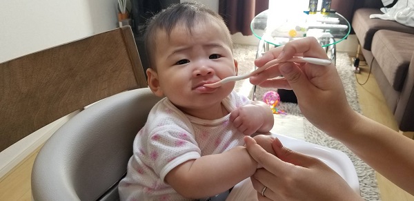 初めての離乳食、こんな顔をしていますが、ちゃんと完食しております(笑)