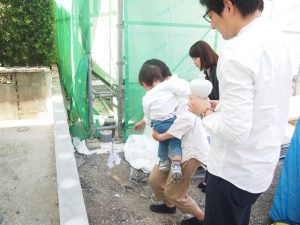 お施主様と設計者が建物の四隅に酒、米、塩をまきます。