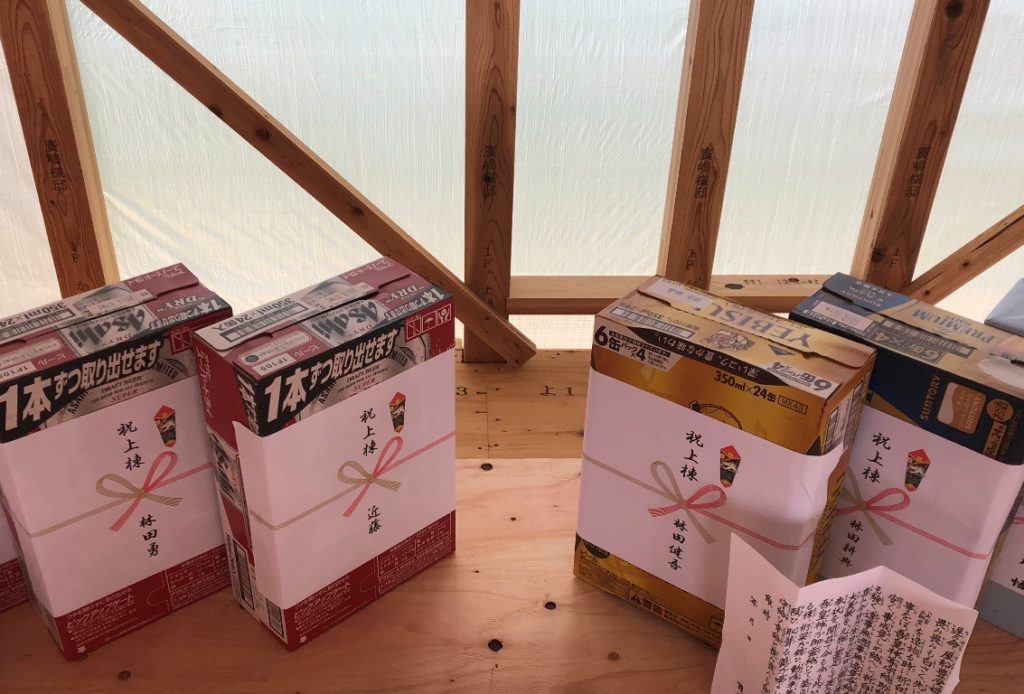 九州八重洲からのビール。上棟祝い品のビール。棟梁たちからのビール。
