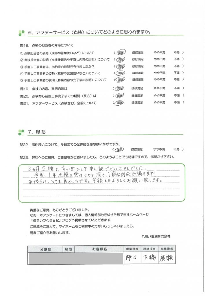 この度、家守り課による1年点検を実施させていただいたお客様より、
