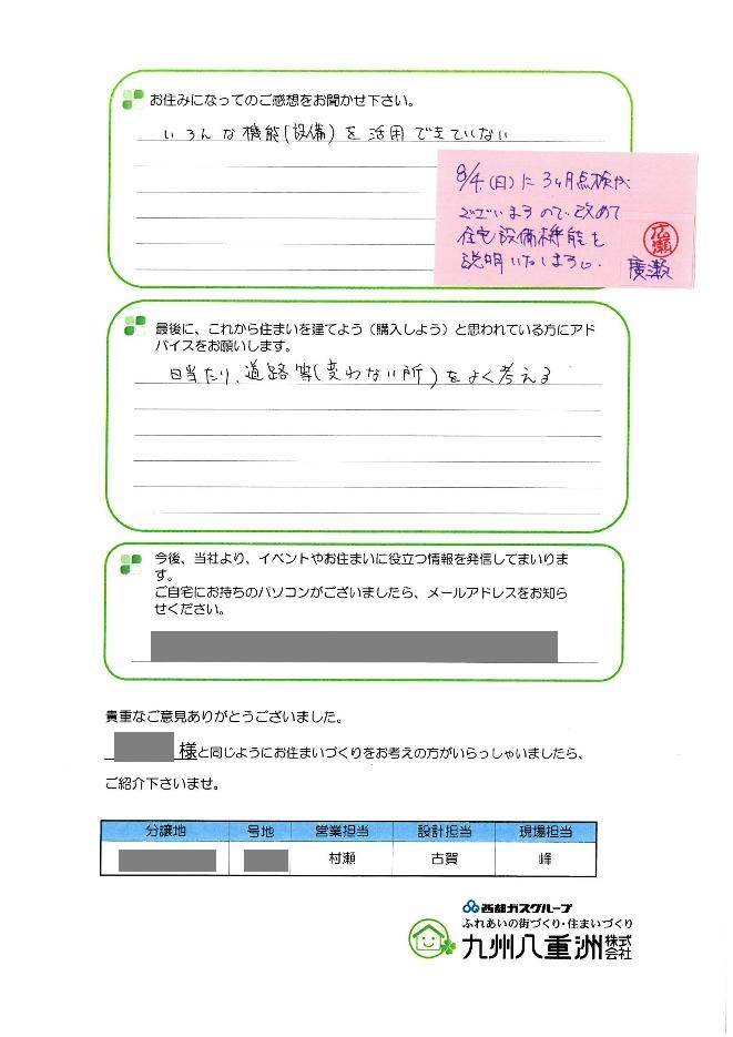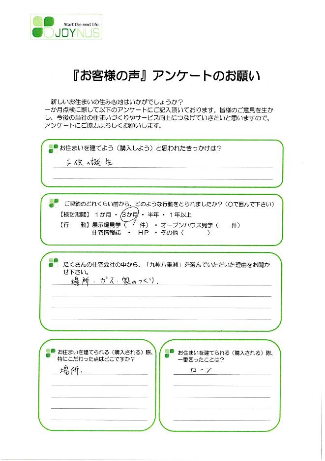 八重洲の家にお住いのお客様より、アンケートを頂きました。