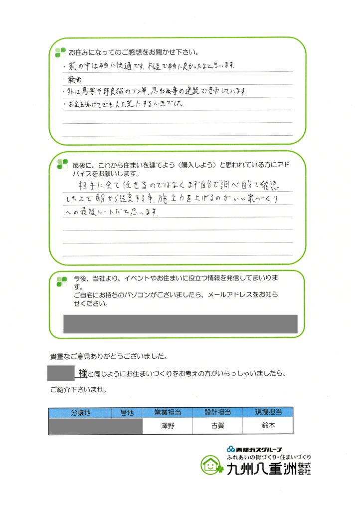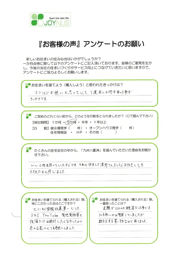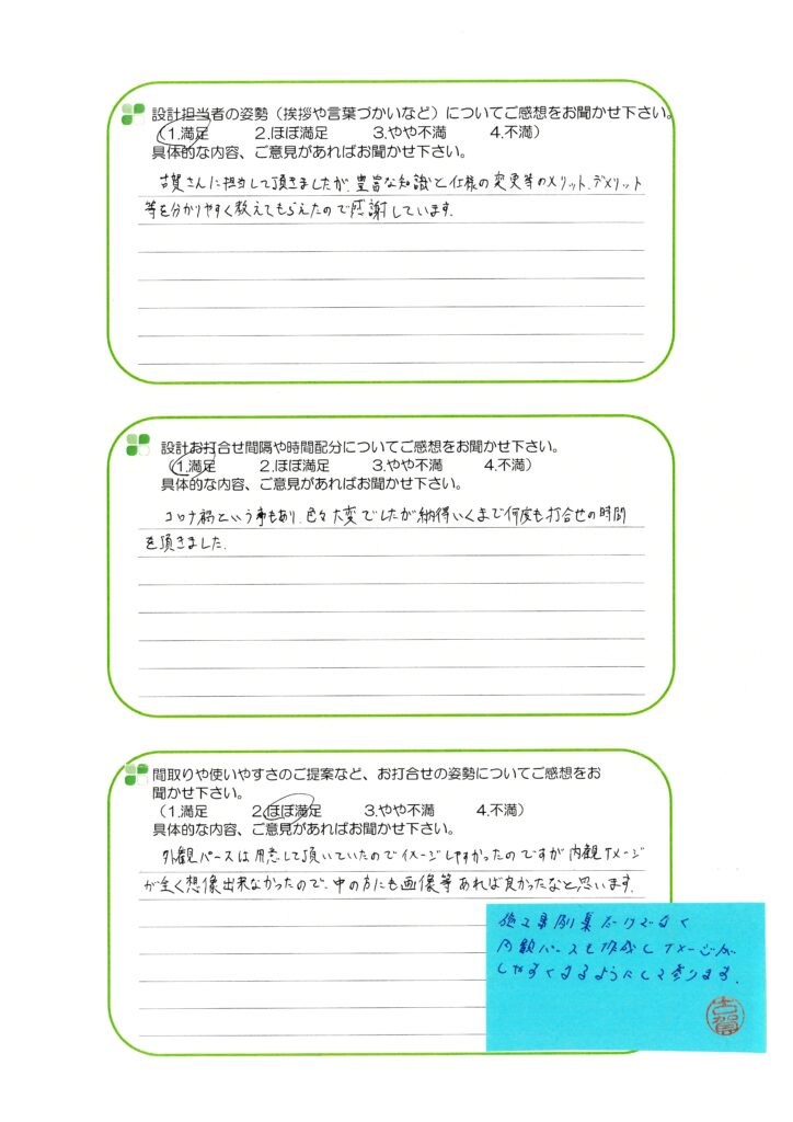 八重洲の家の注文住宅にお住いのお客様より、アンケートを頂きました。
