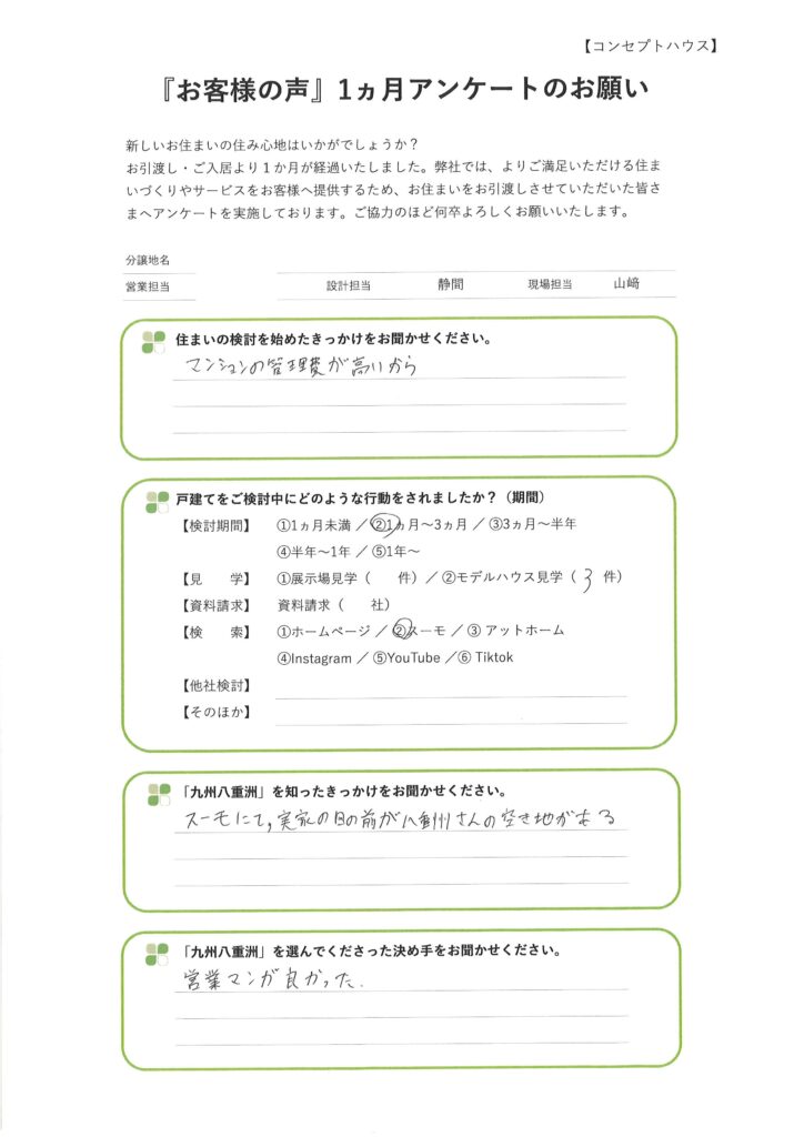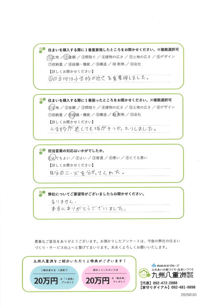 九州八重洲の建売住宅にお住まいの糟屋郡 M様より、「ご入居後1ヵ月アンケート」をいただきました。貴重なご意見を誠にありがとうございます。