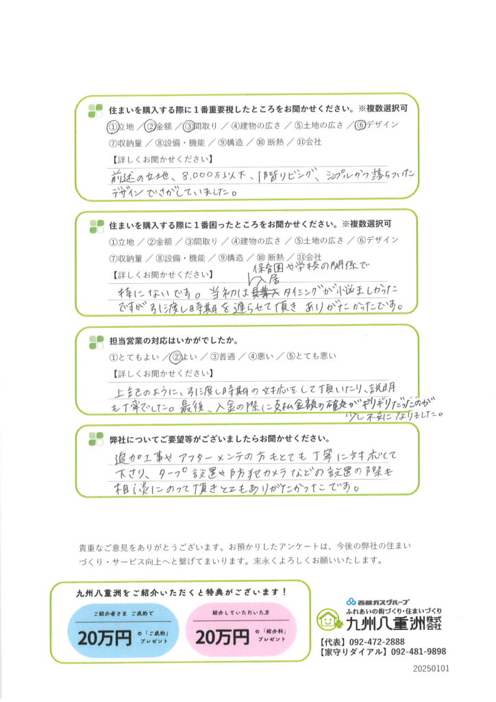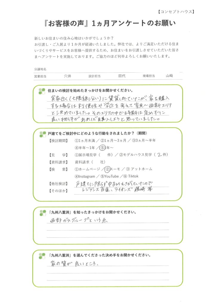 九州八重洲の建売住宅にお住まいの福岡市早良区 W様より、「ご入居後1ヵ月アンケート」をいただきました。貴重なご意見を誠にありがとうございます。