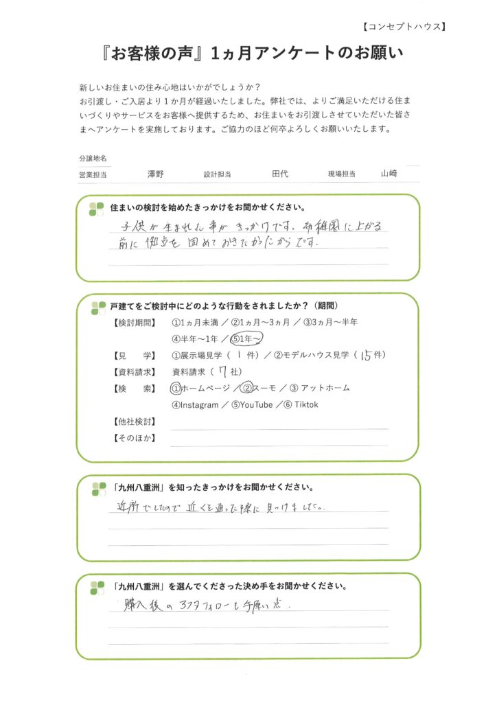 九州八重洲では、お引渡し・ご入居より1ヵ月経過されたお客様へ住まいづくりに関するアンケートを実施させていただいております。住まい購入をご検討中の方は是非ご参考ください。