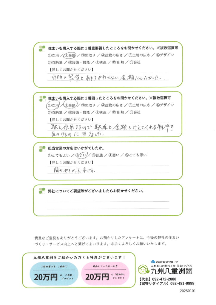 九州八重洲の建売住宅にお住まいの福岡市西区 I様より、「ご入居後1ヵ月アンケート」をいただきました。貴重なご意見を誠にありがとうございます。