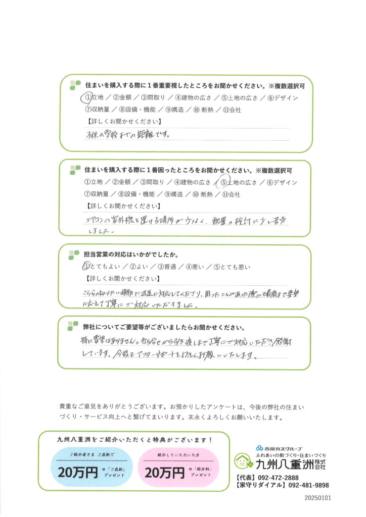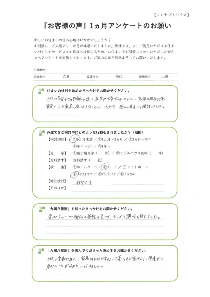 九州八重洲の建売住宅にお住まいの福岡市中央区 K様より、「ご入居後1ヵ月アンケート」をいただきました。貴重なご意見を誠にありがとうございます。