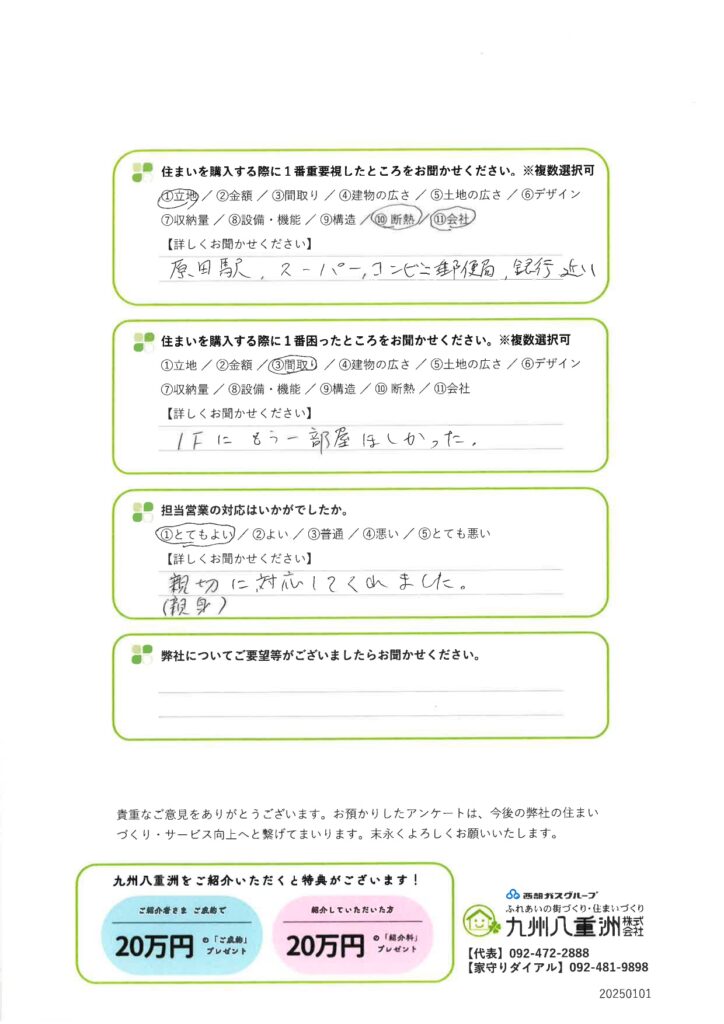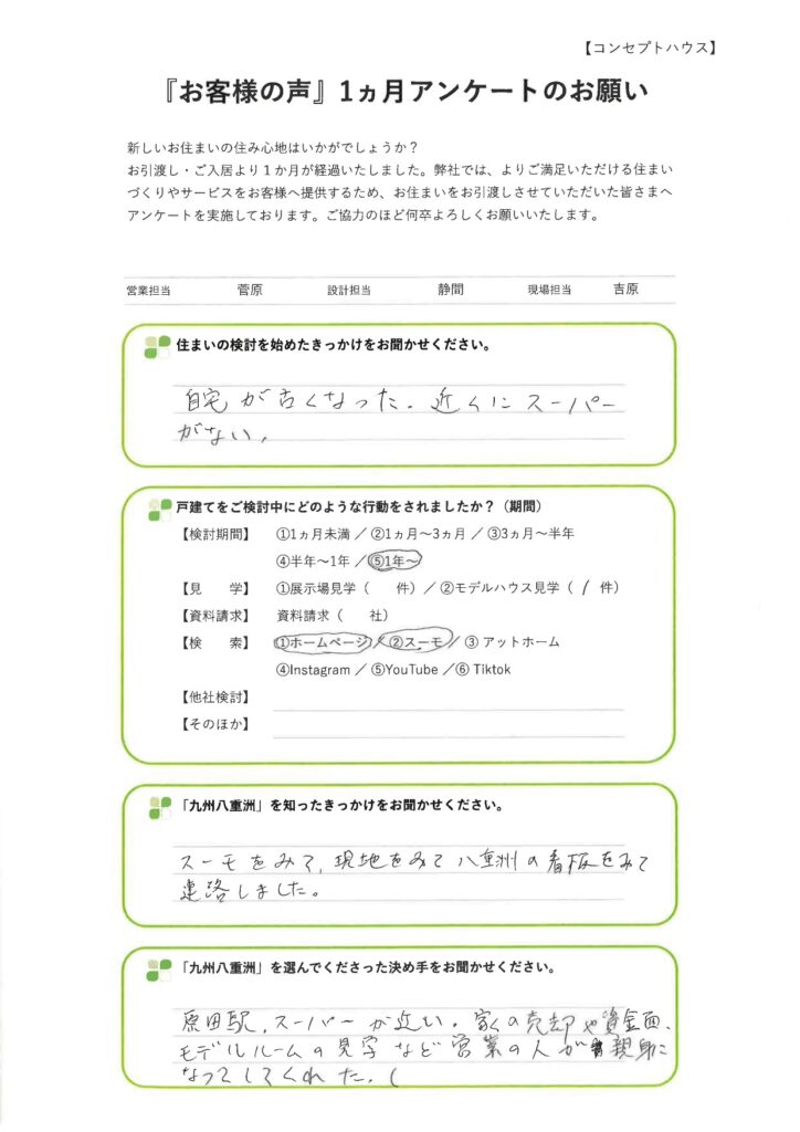 九州八重洲の建売住宅にお住まいの筑紫野市美しが丘南 O様より、「ご入居後1ヵ月アンケート」をいただきました。貴重なご意見を誠にありがとうございます。