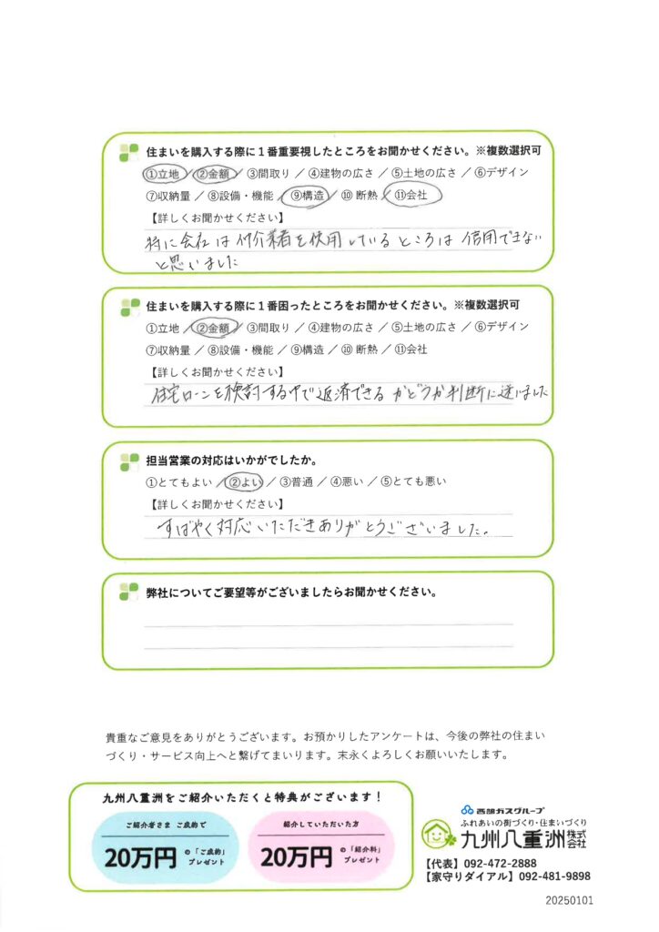 九州八重洲では、お引渡し・ご入居より1ヵ月経過されたお客様へ住まいづくりに関するアンケートを実施させていただいております。住まい購入をご検討中の方は是非ご参考ください。