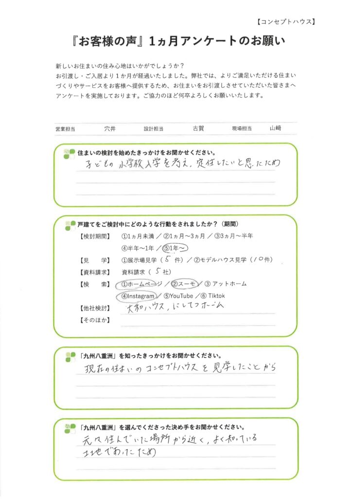 九州八重洲の建売住宅にお住まいの福岡市早良区I様より、「ご入居後1ヵ月アンケート」をいただきました。貴重なご意見を誠にありがとうございます。