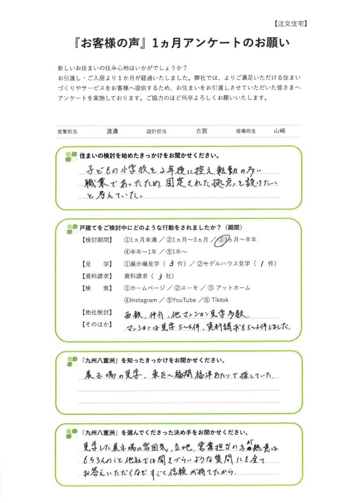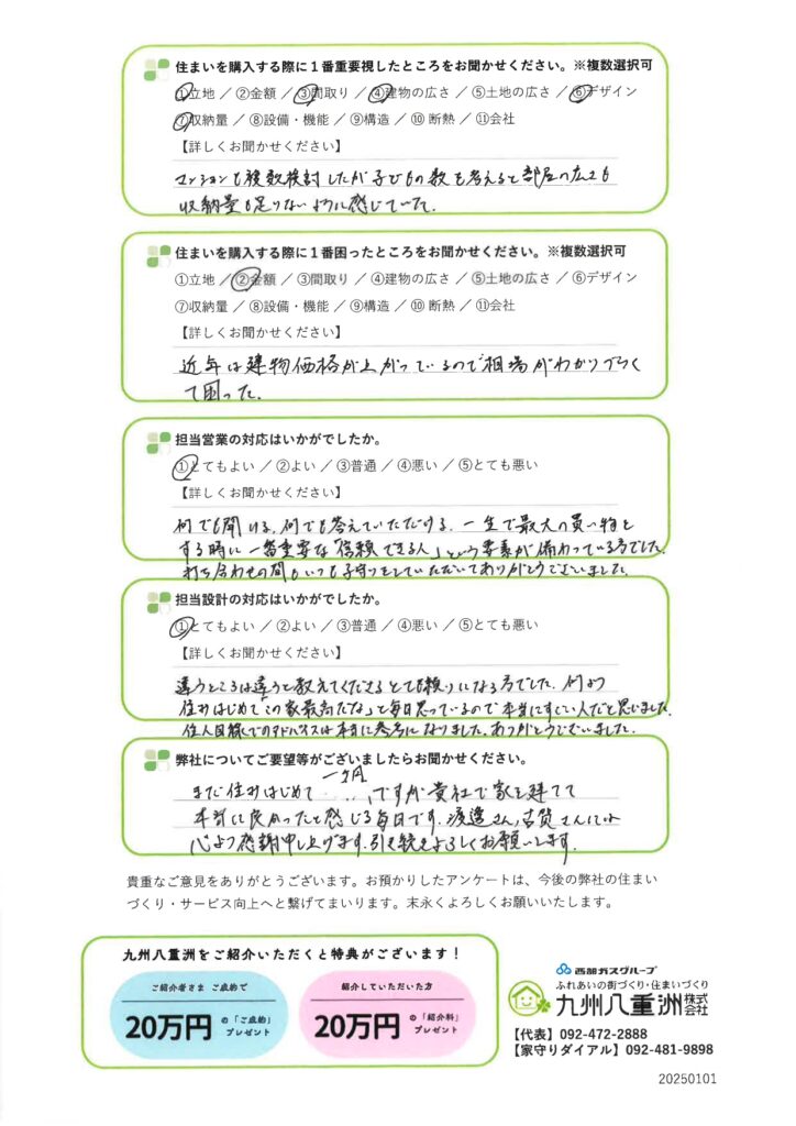 九州八重洲の注文住宅にお住まいの糟屋郡新宮町 M様より、「ご入居後1ヵ月アンケート」をいただきました。貴重なご意見を誠にありがとうございます。