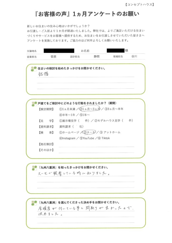 九州八重洲では、お引渡し・ご入居から1ヶ月後にアンケートを実施しています。