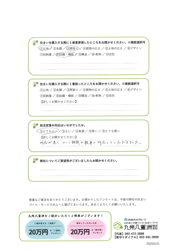 九州八重洲の建売住宅にお住まいの福岡市東区 E様より、「ご入居後1ヵ月アンケート」をいただきました。貴重なご意見を誠にありがとうございます。