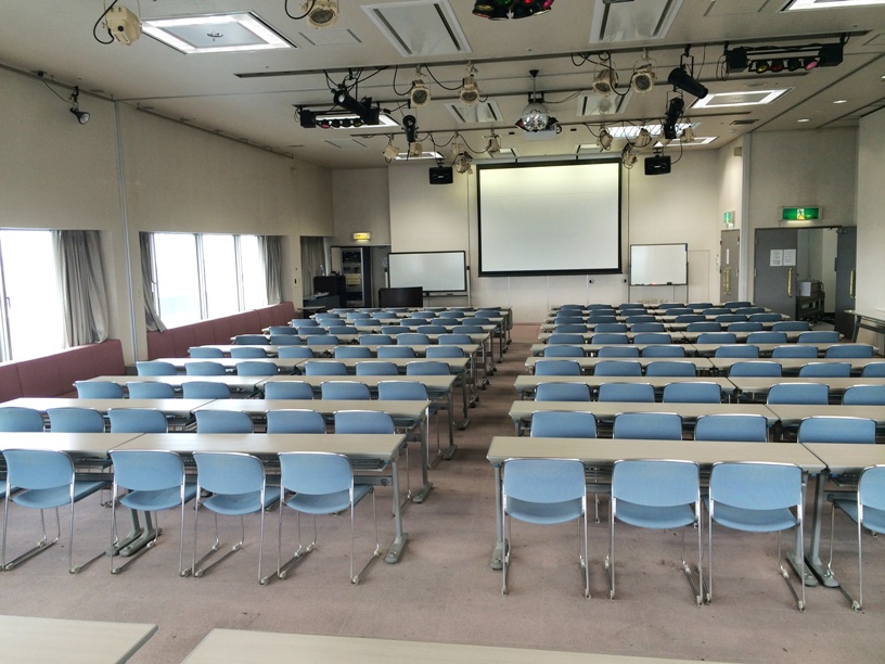 ホールAは定員130名様の会議室(スクール形式3名がけの場合)
