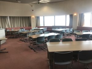 写真はスクール形式ですが、ご要望に合わせてロの字・島形式、机椅子をすべて下げて懇親会形式にも