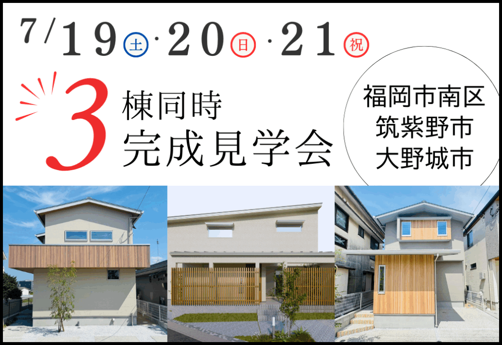 OPENに際しまして、7月19日(土)・20日(日)・21日(月/祝)に 福岡市南区・太宰府市・筑紫野市にて、3棟同時完成見学会を開催いたします✨