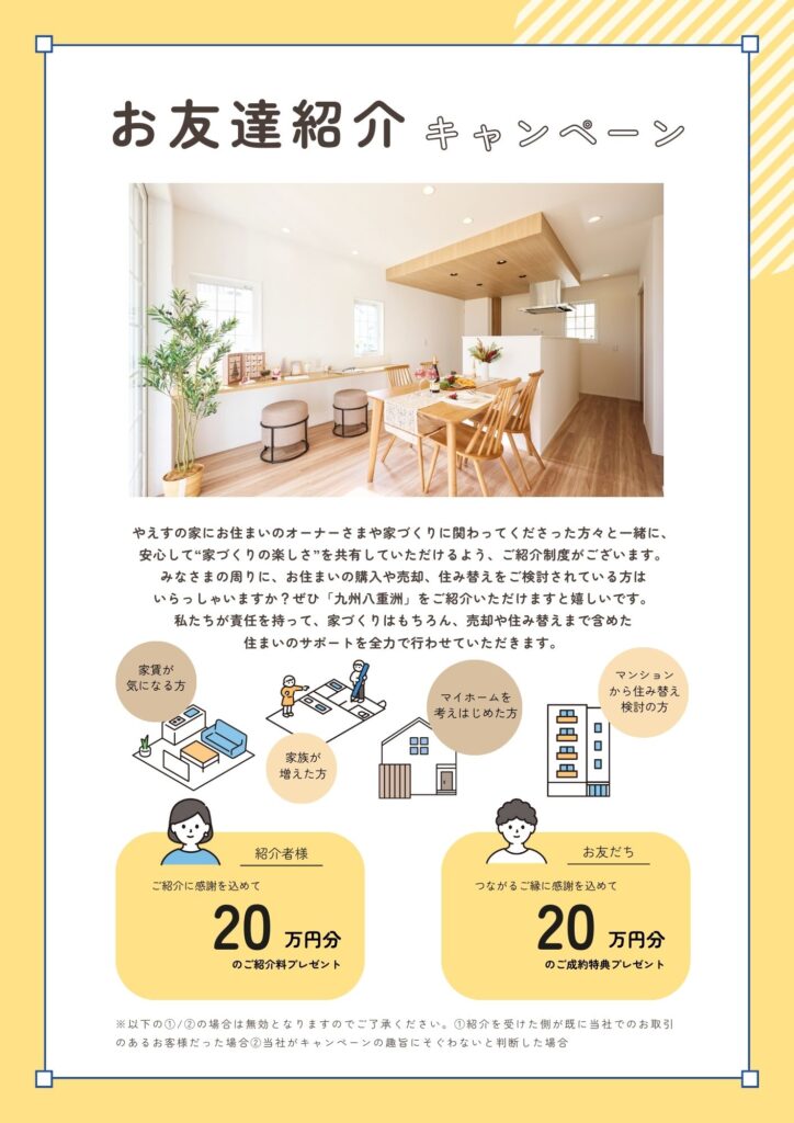 お知り合いの方が、建売住宅・注文住宅・建て替えなどでマイホームを検討されている場合、ぜひ私たちをご紹介ください。 ご契約に至った場合、紹介者さま・ご紹介いただいた方それぞれに 20万円分の特典 をご用意しております💐