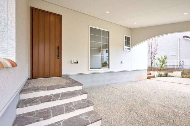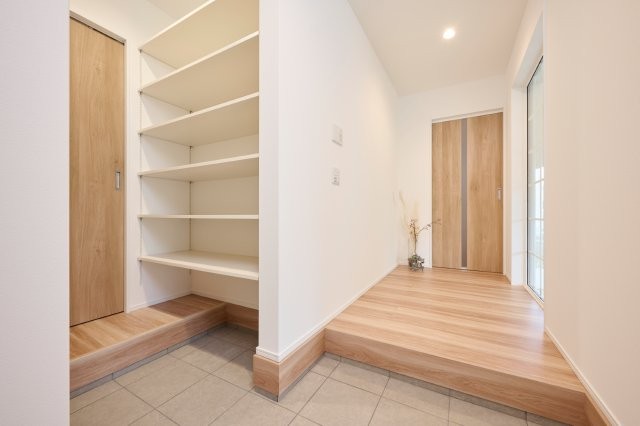 【玄関】玄関からリビング・洗面スペースどちらにも出入りができる2way動線を採用。毎日の動線がスムーズになり暮らしのストレスを軽減します。